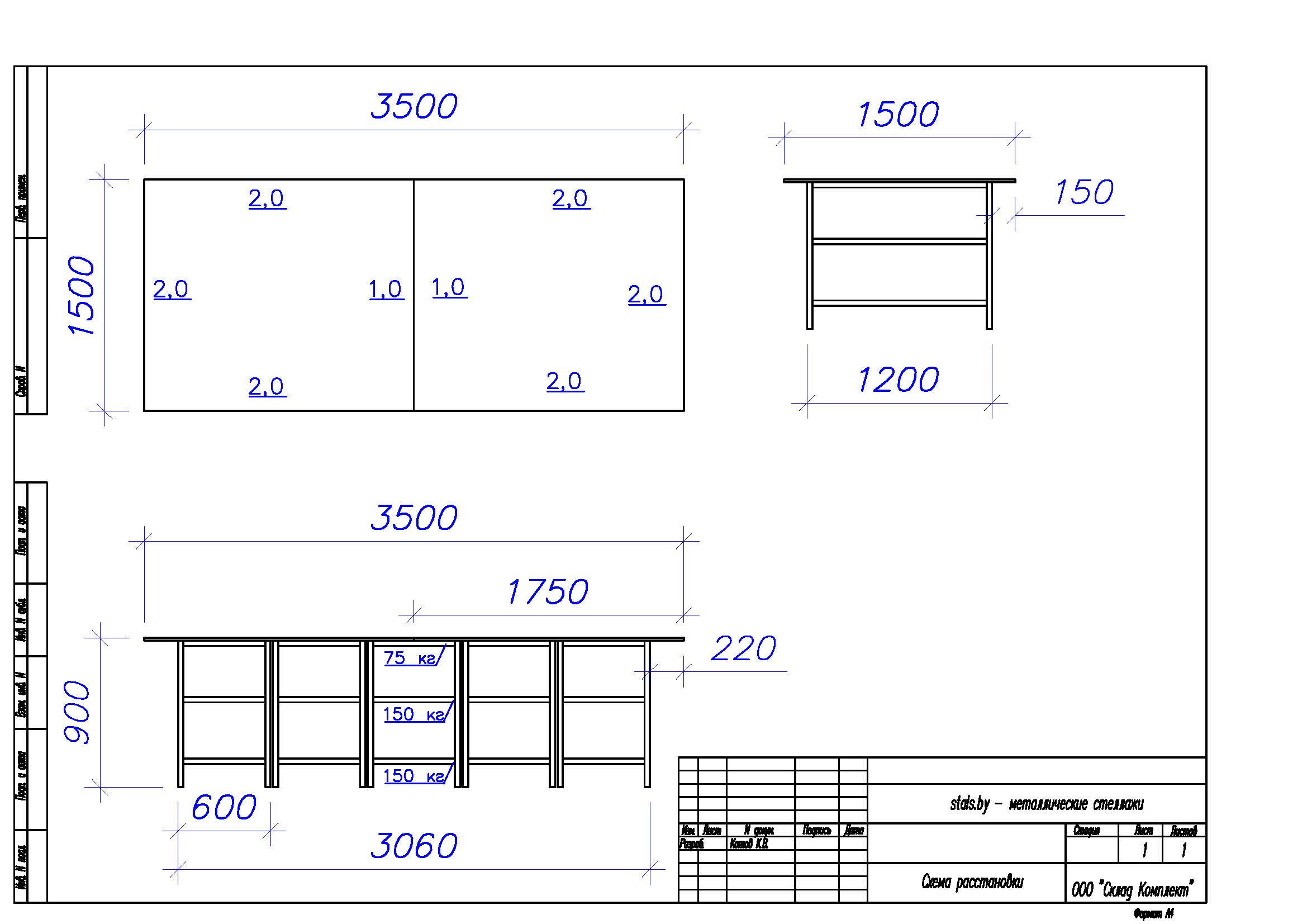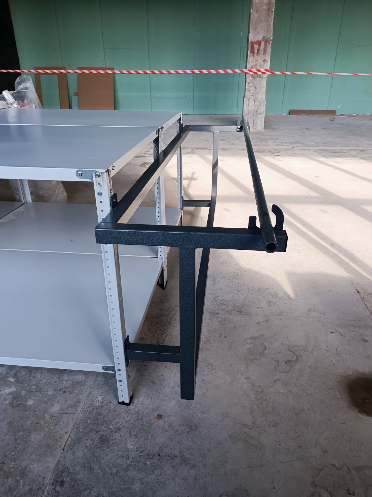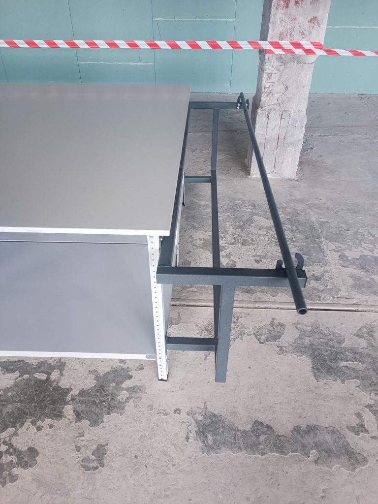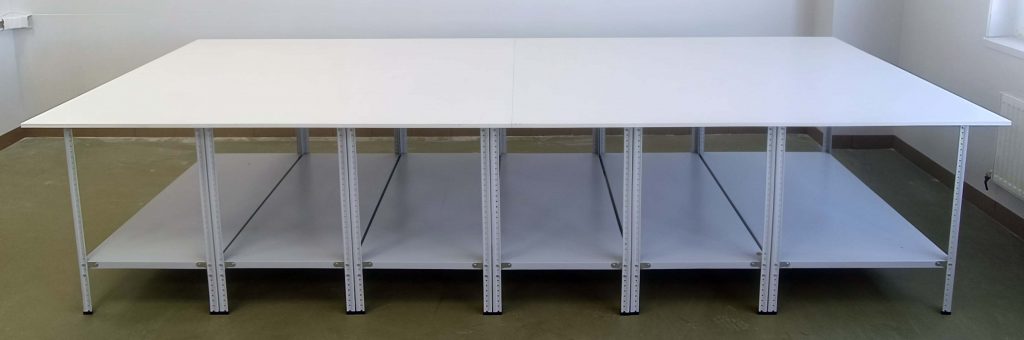 Благодаря своей конструкции стеллажи металлические являются своеобразным конструктором из которого можно собрать весьма неожиданные вещи. Для одного из наших постоянных клиентов был изготовлен раскроечный стол. По заявке клиента стол должен был иметь сплошную столешницу размером 2750 х 1600 мм. Высота стола для удобства работы должна составлять 950 мм. Стол для раскроя тканей было решено изготовить на основе стеллажей архивных, столешницу сделать из ламинированного ДСП.