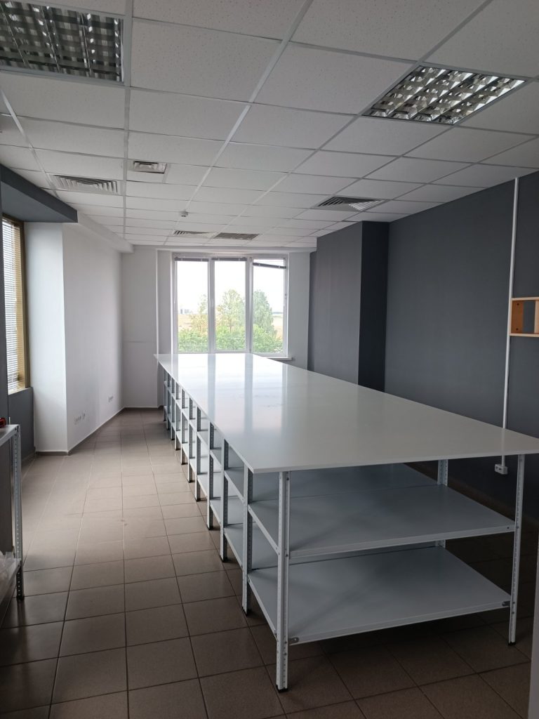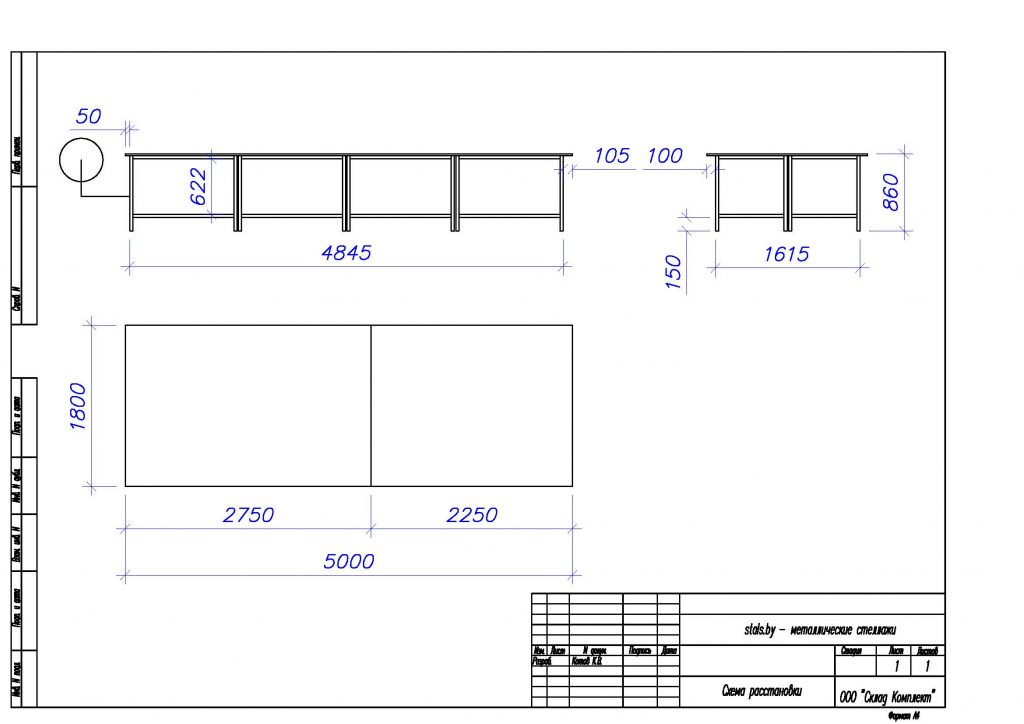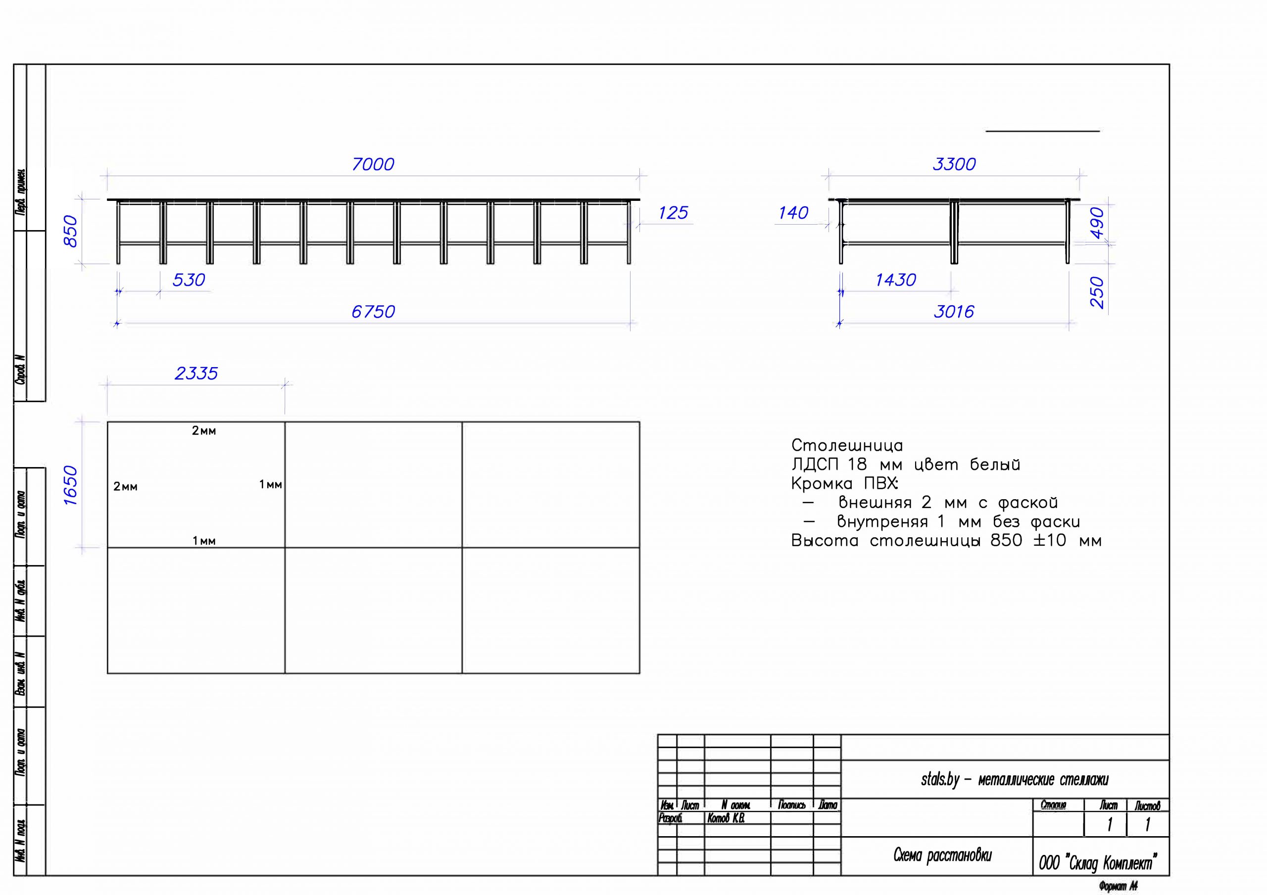Благодаря своей конструкции стеллажи металлические являются своеобразным конструктором из которого можно собрать весьма неожиданные вещи. Для одного из наших постоянных клиентов был изготовлен раскроечный стол. По заявке клиента стол должен был иметь сплошную столешницу размером 2750 х 1600 мм. Высота стола для удобства работы должна составлять 950 мм. Стол для раскроя тканей было решено изготовить на основе стеллажей архивных, столешницу сделать из ламинированного ДСП.