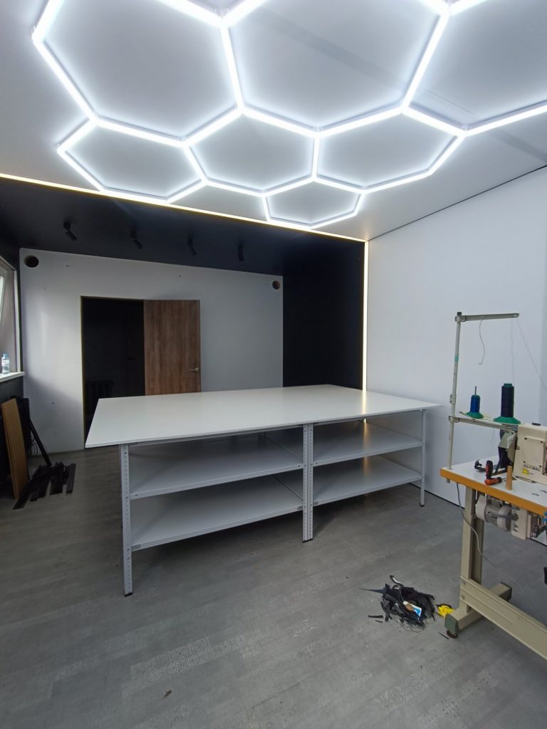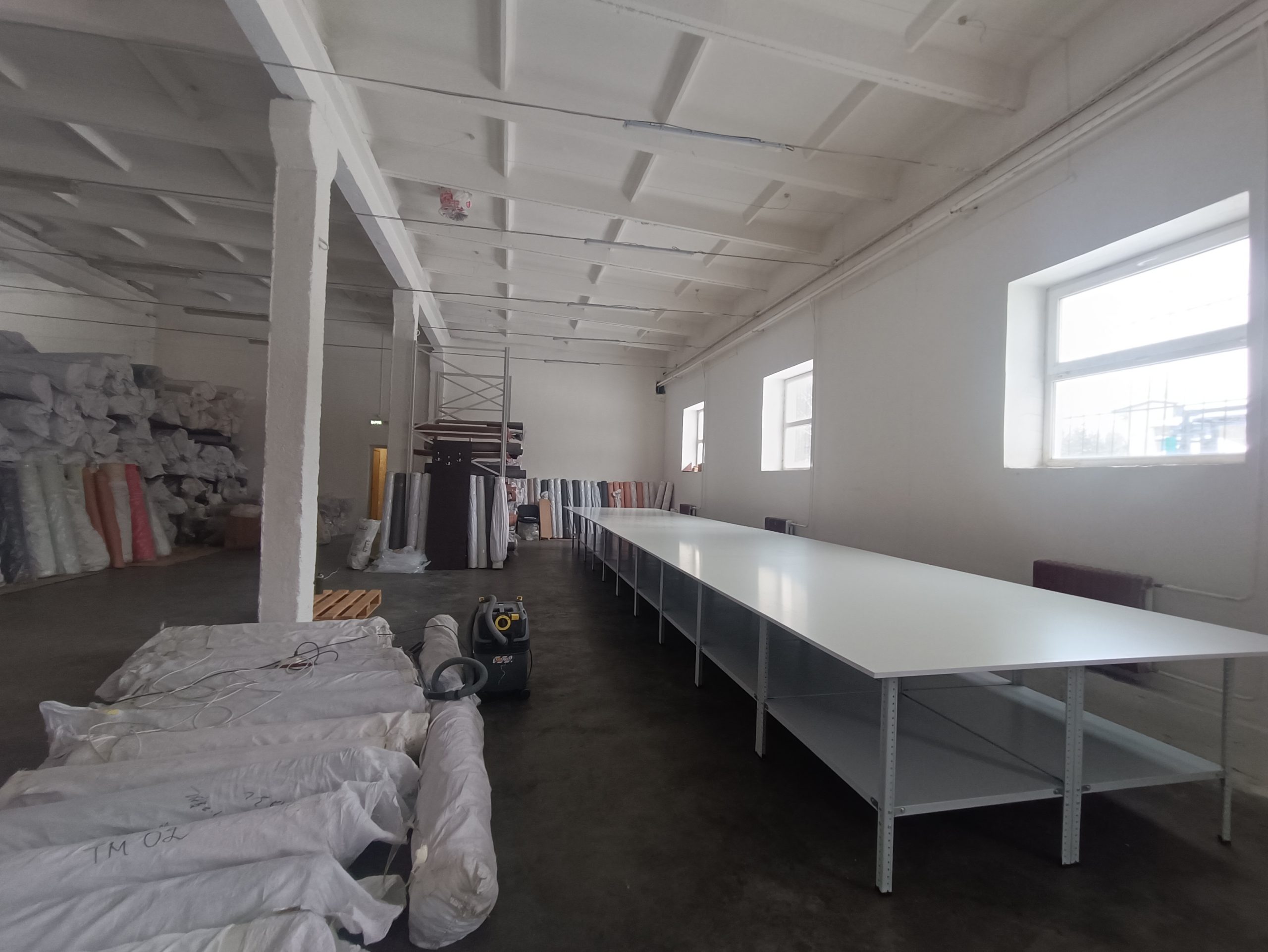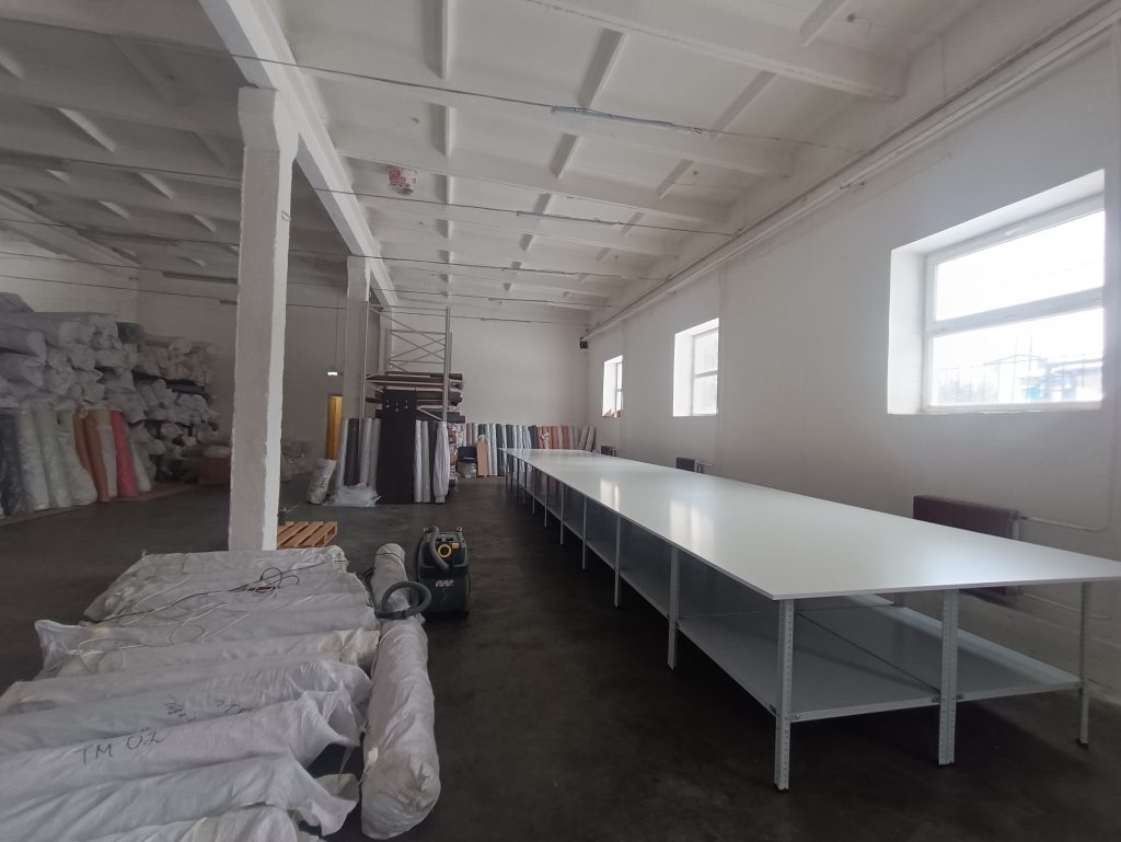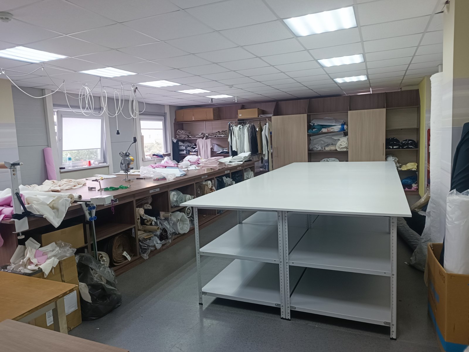 Для организации хранения тканей, инструментов и приспособлений в подстолье установлены металлические стеллажи.